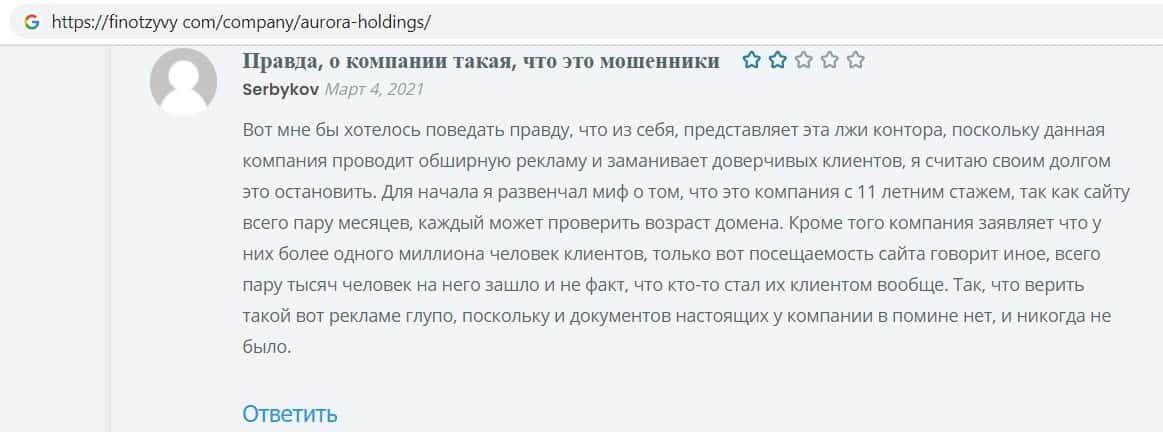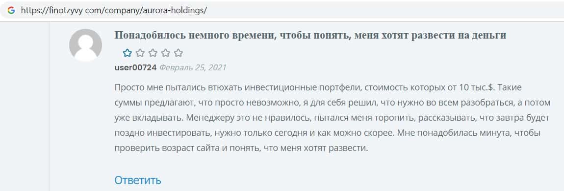 Перед вами отзыв пользователя о конторе Аврора Холдингс, в котором он сообщил, что прочитал отзывы о компании и перестал доверять ей, так как они на самом деле мошенники.