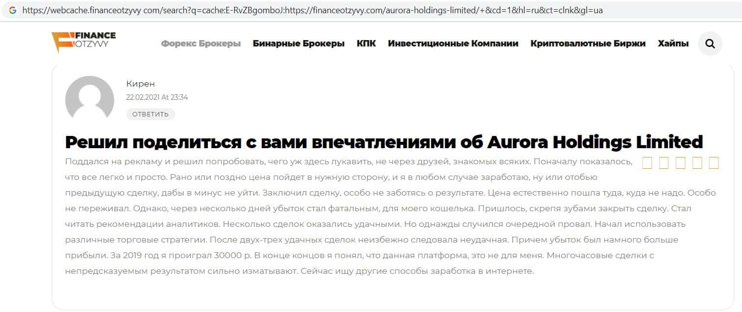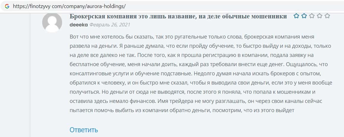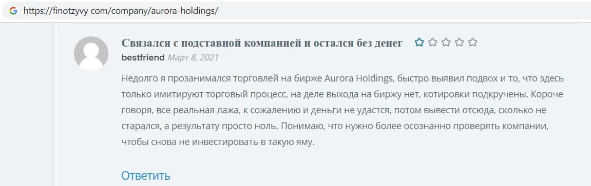 Ниже вы можете увидеть отзыв клиента компании Аврора Холдингс, который поведал, псевдоброкер развёл его на денежные средства и помог слить весь депозит.