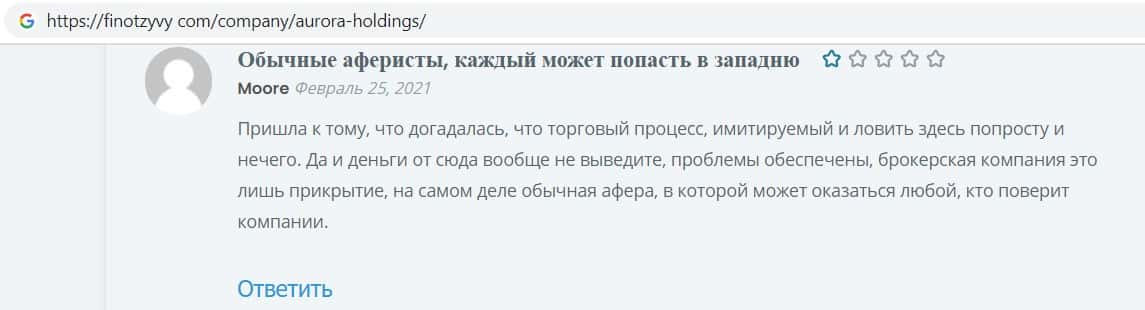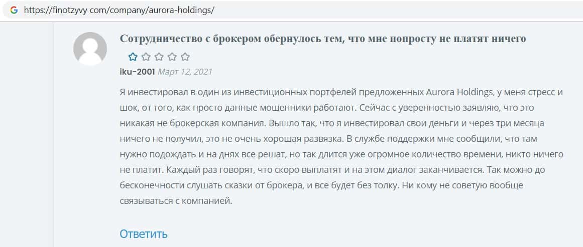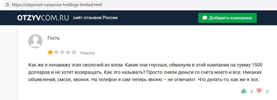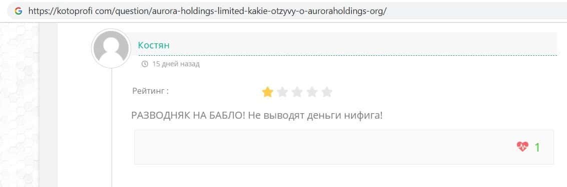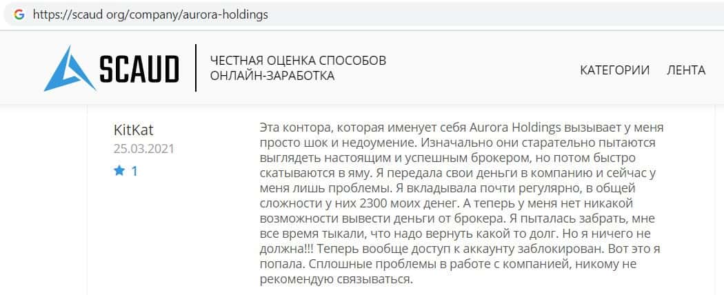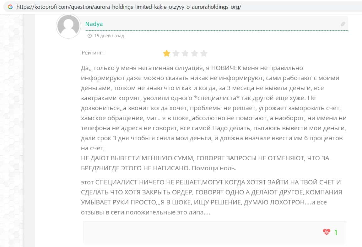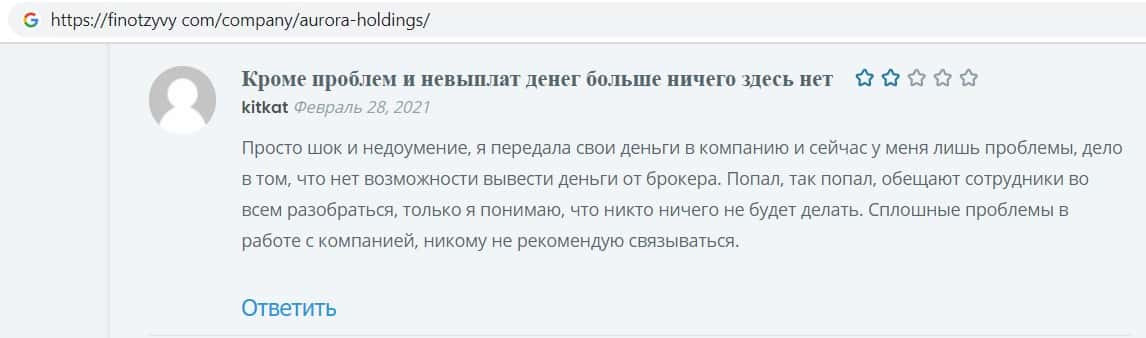 Ещё один пользователь сообщил в своём отзыве, что фирма Аврора Холдингс является полным разводняком, так как не хочет выводить денежные средства клиентов.