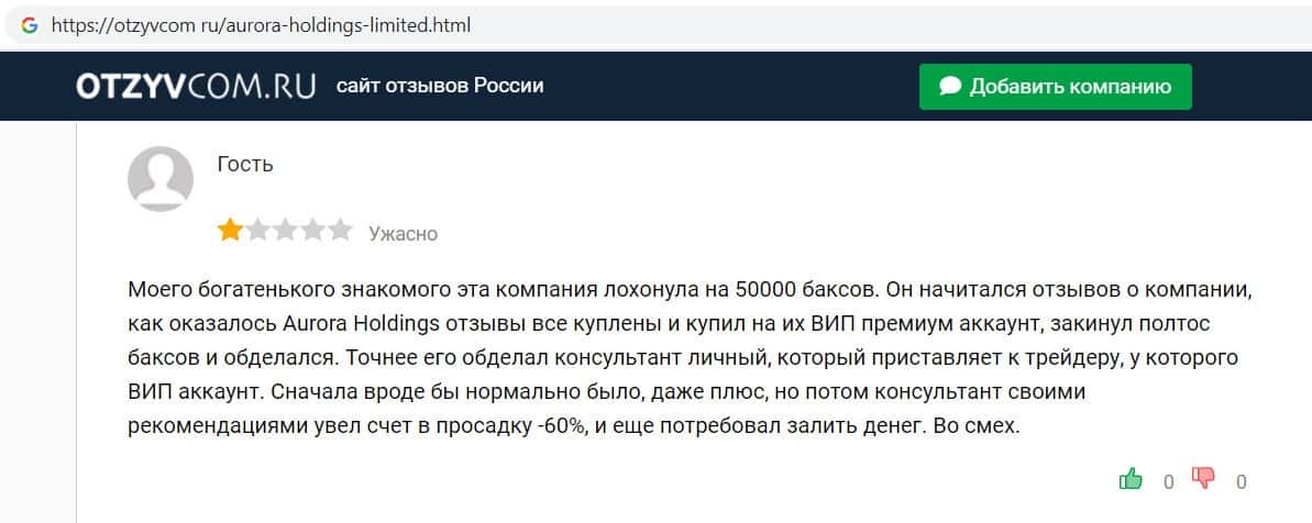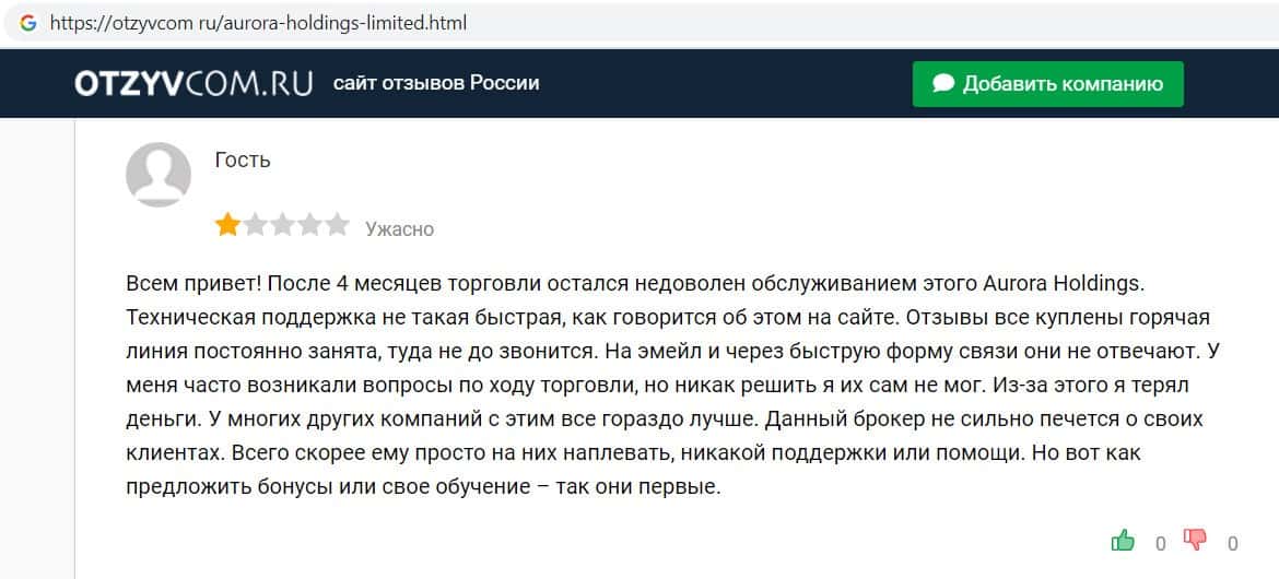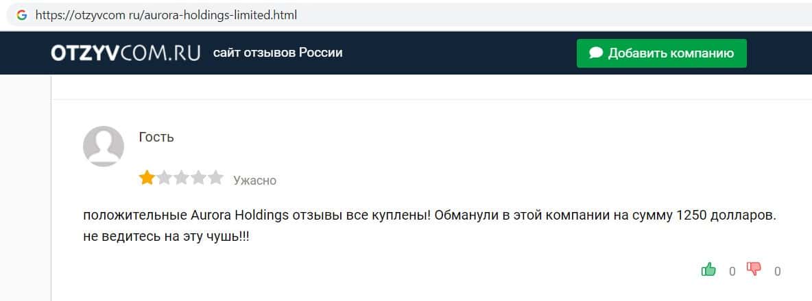 Пользователь в своём отзыве о конторе AuroraHoldings Org выразил своё недовольство фирмой, так как считает их мошенниками, которые покупают положительные отзывы.