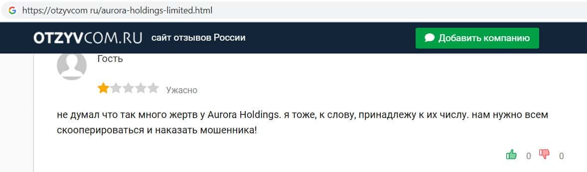 В этом отзыве пользователь написал, что не думал что у конторы AuroraHoldings Org так много жертв, и предложил пострадавшим объединиться, чтобы наказать мошенника.