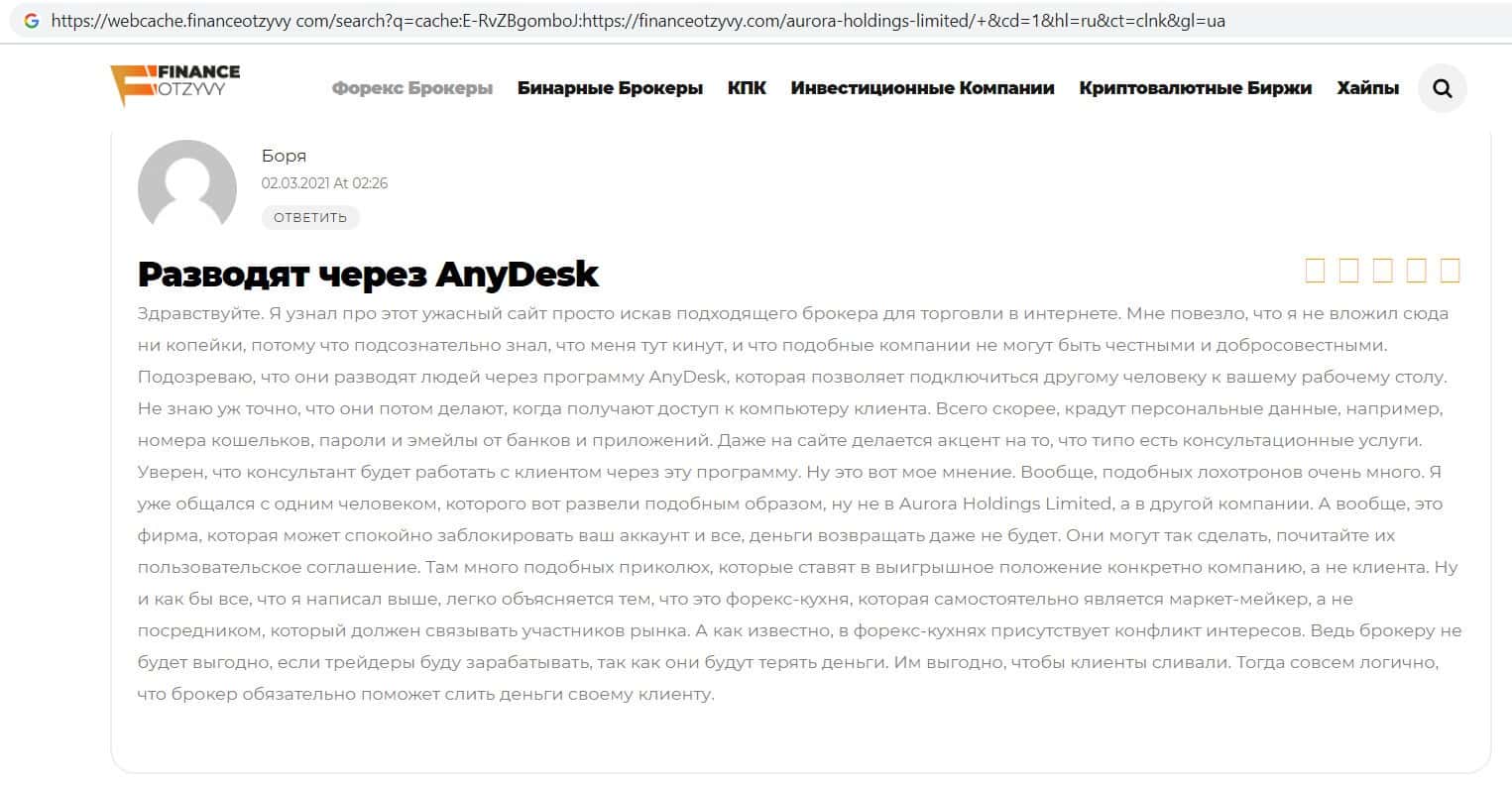 Ещё один пользователь написал отзыв, в котором сообщил, что фирма Аврора Холдингс разводит клиентов через программу для управления рабочим столом.
