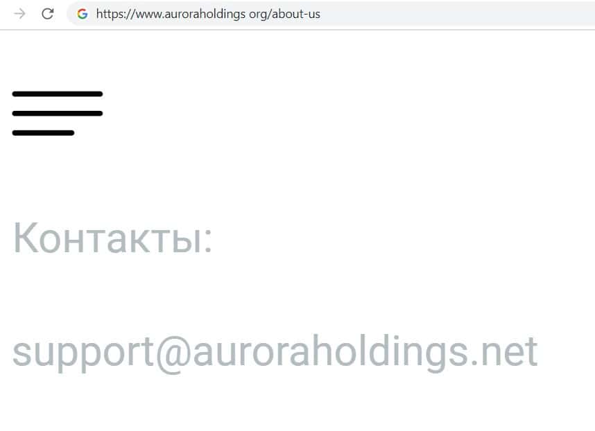 Так же псевдоброкер Аврора Холдингс указал контактный адрес электронной почты, но только поддержка лохотрона никогда не отвечает пользователям. Почта мошенников: