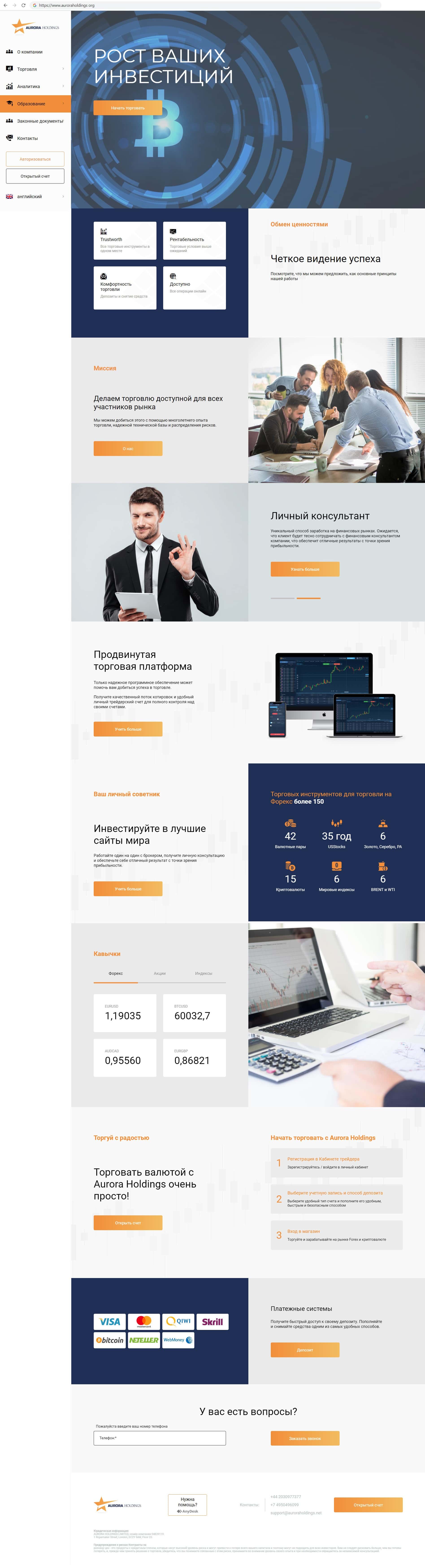 Внешний вид главного сайта лжеброкера AuroraHoldings Org