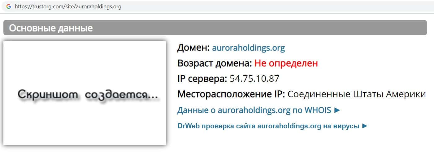 Мы решили узнать возраст сайта жулики Аврора Холдингс с помощью сайта "Доверие в Сети", но оказалось, что разводилы скрывают эту информацию, что очень подозрительно.