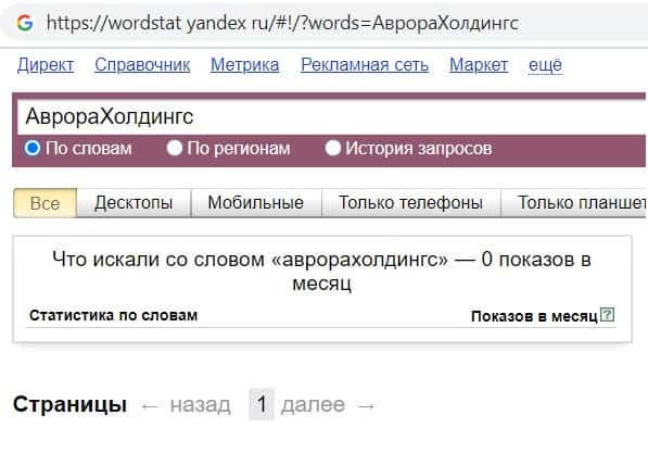 Далее мы проверили количество запросов конторы AuroraHoldings Org по русскоязычному названию компании, а именно "Аврора Холдингс", ни и этот запрос никто не выполнял.