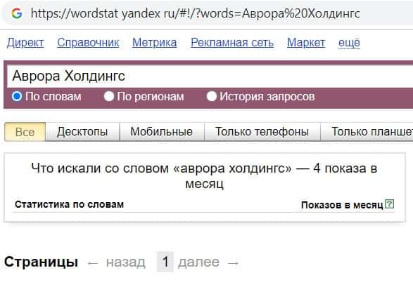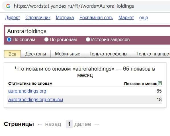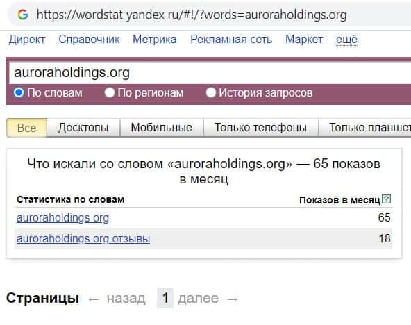 Мы решили проверить количество запросов компании AuroraHoldings Org в Яндексе по названию фирмы, а именно "AuroraHoldings". 65 раз пользователи совершили этот запрос.