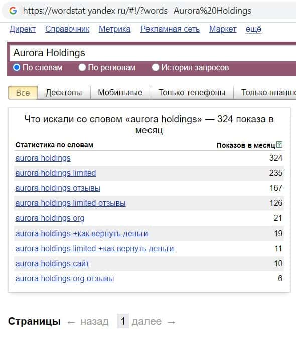 Мы так же проверили количество запросов компании жуликов AuroraHoldings Org по названию фирмы, но с пробелом, а именно "Aurora Holdings", но результат - нулевой.
