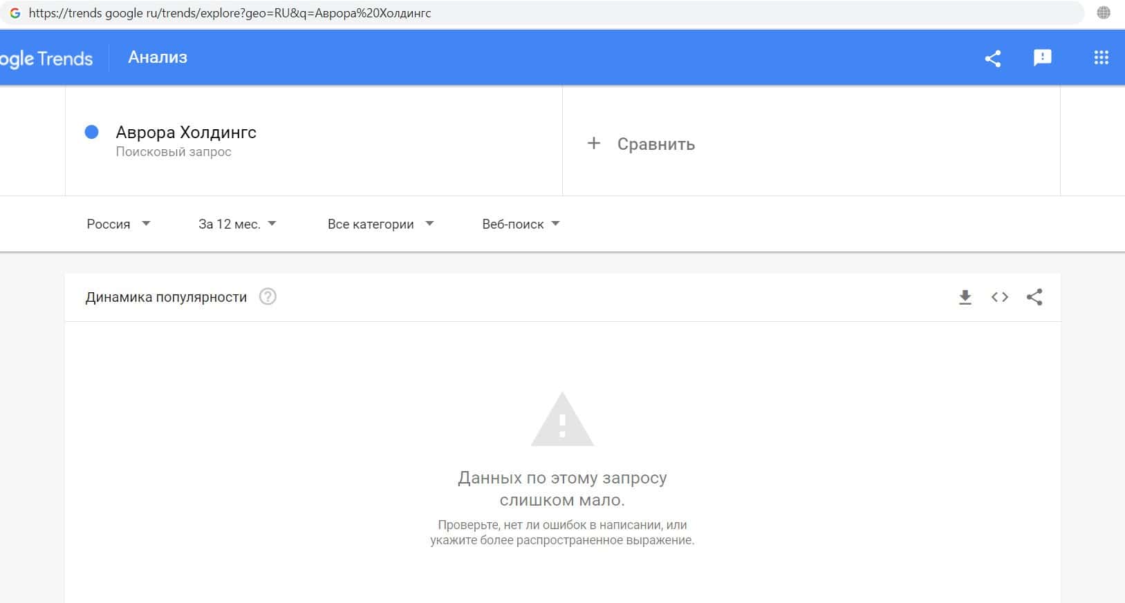 Мы проверили количество запросов компании мошенников AuroraHoldings Org в Google по названию фирмы, а именно "AuroraHoldings", но этот запрос никто не выполнял целый год.