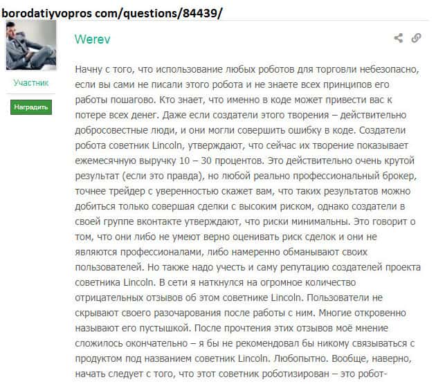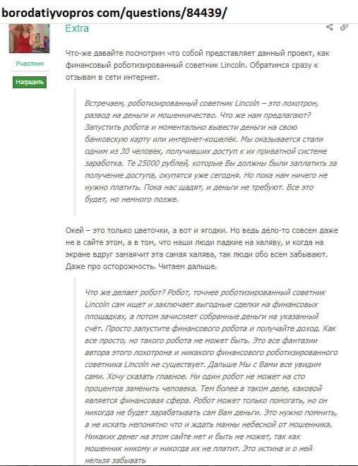 Шаражкина контора AvtomatFX распространяет информацию о нереальных доходах с помощью их новой разработки - советника Lincoln. Такой развод рассчитан только на новичков на финансовом рынке, которые еще не понимают, что прибыль почти 300% - это не реально! Ни один брокер не смог бы работать в таких условиях! Это заведомо провальное предприятие!Лохокухня Автомат ФХ утверждает, что их робот дает ежемесячно до 30% прибыли