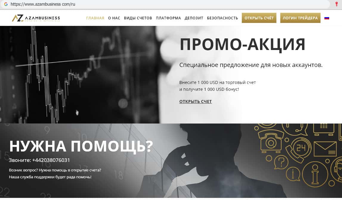 Следом за общим представлением торговой площадки идут высокопарные самовлюбленные заявления о возможностях и сервисах, предоставляемых брокерской компанией Azam Business. Анонсируется небольшая приманка для наивного посетителя в качестве предлагаемого бонуса в размере виртуальных 1000 американских долларов.