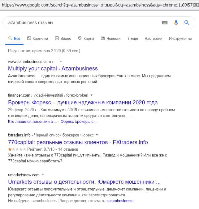 Хотя на первый взгляд брокерская компания Azam Business и создаёт впечатление серьёзной и добропорядочной, найти в сети Интернет реальные отзывы о работе этой торговой площадки практически нереально. Отсутствуют также и обзоры компании и её сервисов. А это довольно тревожный сигнал о высокой вероятности мошенничества.