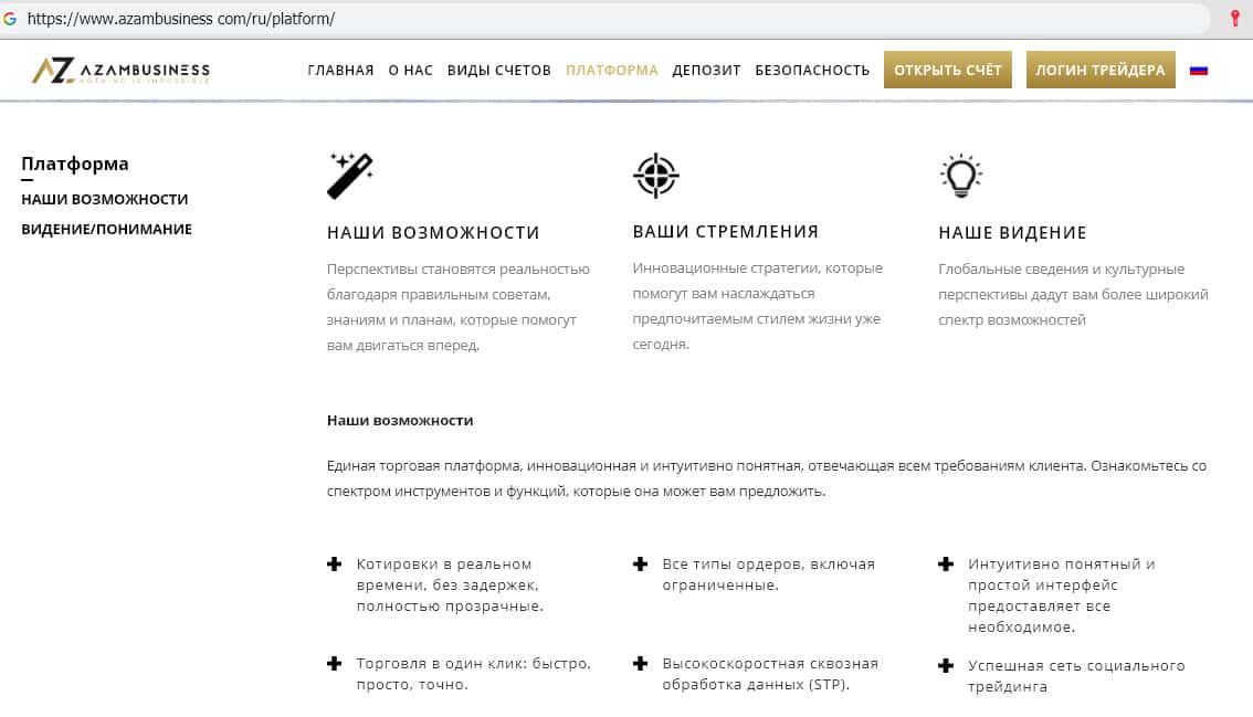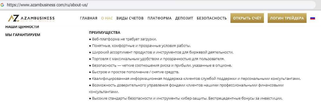 Занимательный момент: только на странице о компании можно найти сведения, чем можно торговать на брокерской площадке Azam Business, да и то только вскользь. Сказано лишь, что доступна торговля валютами, фьючерсами и товарами. Подробная информация засекречена, и доступна лишь зарегистрированным клиентам.
