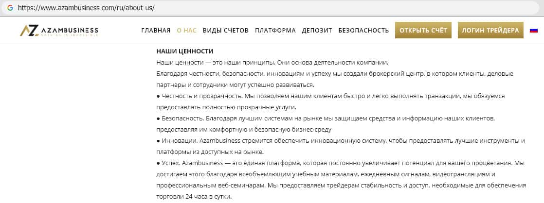 Росказни мошенников о своей компании начинаются с бредней о том, как команда Azam Business переживает об удобстве трейдеров, о их благополучии, в то время как на самом деле они заботятся о том, как привлечь побольше наивных клиентов, как побольше выманить у них денег, и спокойно скрыться.