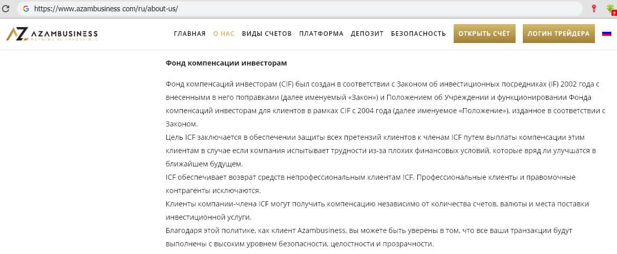 Аналогичное враньё мошенники рассказывают о фонде компенсации инвесторам. Данный компенсационный фонд сотрудничает только с брокерами, имеющими лицензию Кипрской Cysec. А рассматриваемая нами брокерская контора Azam Business не имеет никаких лицензий.