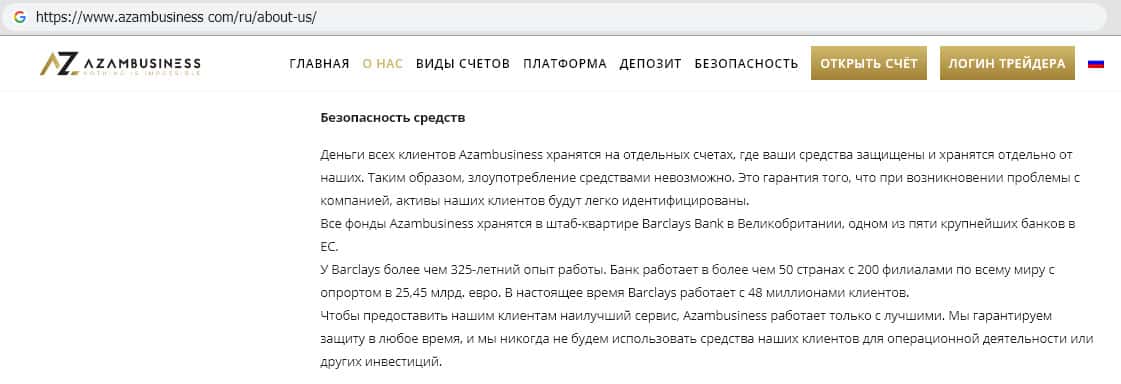 Но при отсутствии такового регулирования использование сегрегированных счетов брокерской площадкой не то, что маловероятно, а практически невозможно. А упоминаемый всвязи с этим банк Barclays является всего лишь прикрытием лжи и обмана клиентов торговой площадки Azam Business. Тем более средства, по заявлению аферистов, хранятся ни где-нибудь, а в штаб-квартире Barclays Bank.