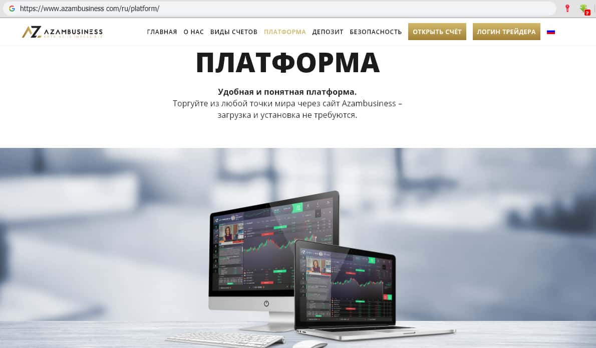 Брокерская компания Azam Business предлагает своими трейдерам воспользоваться торговой платформой собственного производства, базирующейся на вэб-технологии, и как следствие не зависящей от типа устройства и операционной системы трейдера, а также не требуется скачивание и установка дополнительных программ.