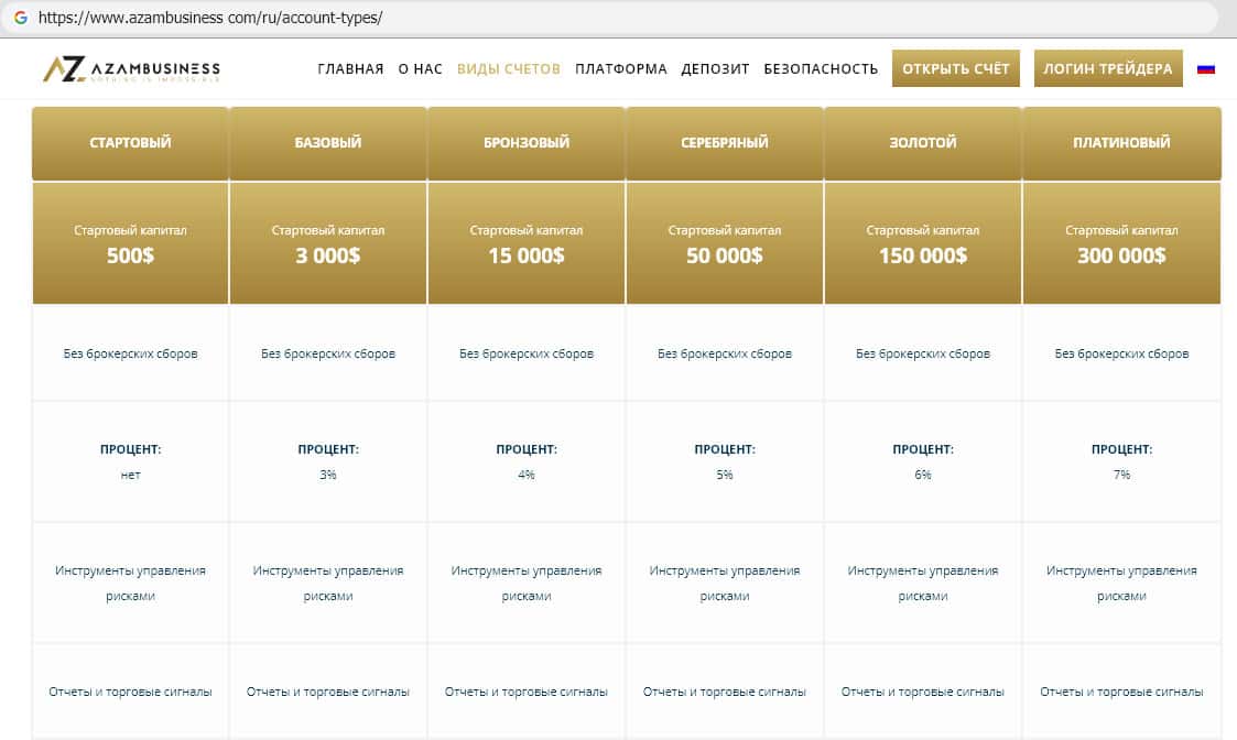 Для страждущих расстаться со своими сбережениями брокерская площадка Azam Business предлагает широкий выбор торговых аккаунтов. От самого простого "стартового" до самого продвинутого "платинового". Всего на торговой площадке Азам Бизнес шесть градаций торговых аккаунтов. Основное различие аккаунтов в размере минимального депозита. Он колеблется от пятисот до трехсот тысяч американских долларов.