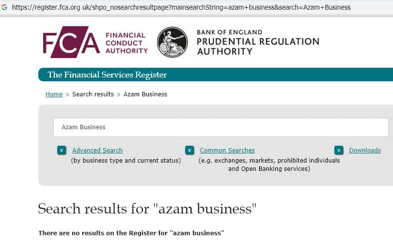 И естественно, ожидаемые результаты принесла проверка лицензирования и регулирования брокерской деятельности компании Азам Бизнес в Английской финансовой комиссии (FCA).