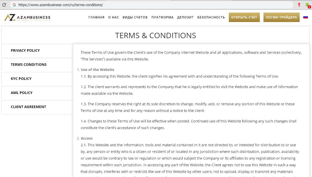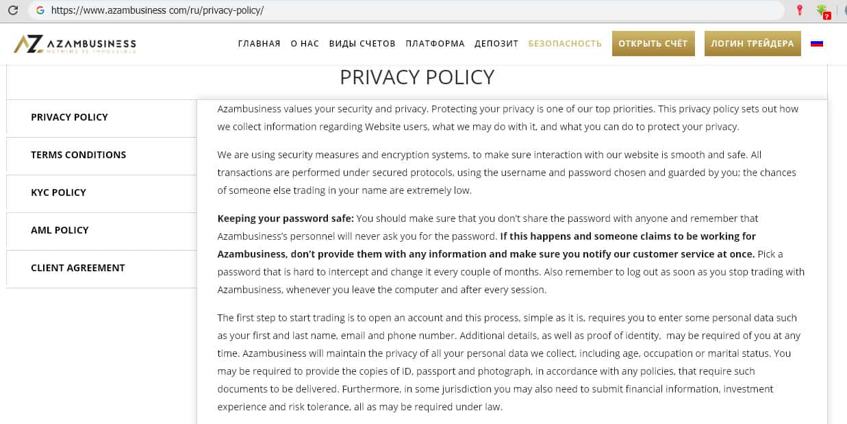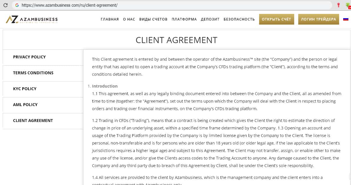 В предыдущем разделе мы говорили о несоответствии "клиентского соглашения" брокерской конторы Azam Business нормативным документам. Но нельзя не упомянуть для какой цели пишутся и публикуются данные "документы". Во-первых, их наличие создаёт иллюзию добропорядочности и серьёзности брокерской компании.