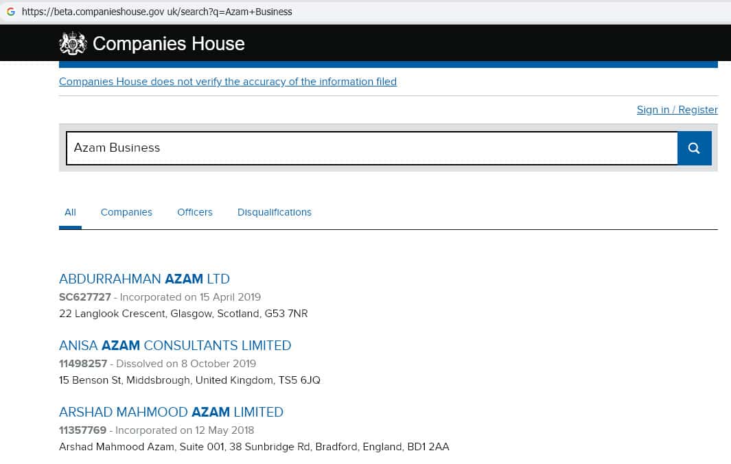 В "клиентском соглашении" аферисты говорят о Лондонском размещении и принадлежности к Английской юрисдикции. Решив проверить данную информацию, мы решили посетить реестр компаний Англии. Как и ожидалось, никакой Azam Business в Англии не зарегистрировано, а вся информация, приводимая на портале мошенников полная ложь.
