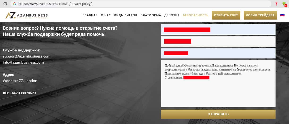 На портале брокера также имеется форма обратной связи. Но её главное назначение собирать контактные данные интересующихся темой торговли на брокерских площадках посетителей. Так как заданный нами неудобный вопрос к технической поддержке о лицензировании их деятельности остался без ответа.
