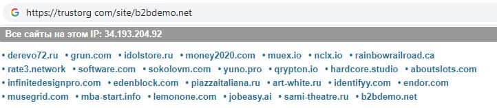На информационном сайте trustorg com была произведена проверка ip-адреса мошеннической организации Б2Б Демо. Выяснилось, что сайт данной скам-организации находится по соседству с сайтами, которые не имеют никакого отношения к рынку Форекс с онлайн-играми и интернет магазинами.