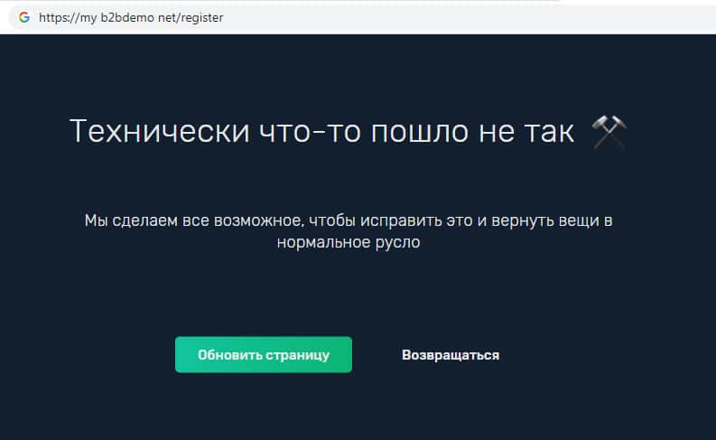 При попытке открытия бланка для регистрации произошла ошибка, взглянуть на бланк для регистрации на сайте мошенников Б2Б Демо оказалось невозможным. Подобные ошибки зачастую возникают в том случае, если сайт был разработан коряво, на скорую руку, что очень часто встречается на подобных фейковых интернет-ресурсах.