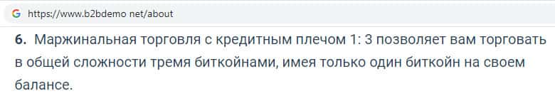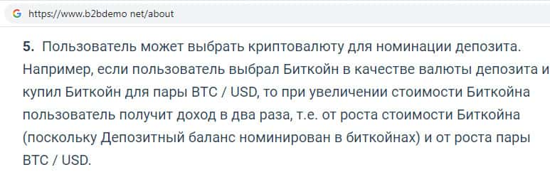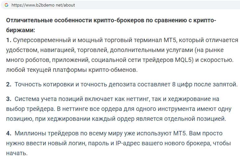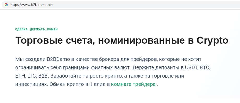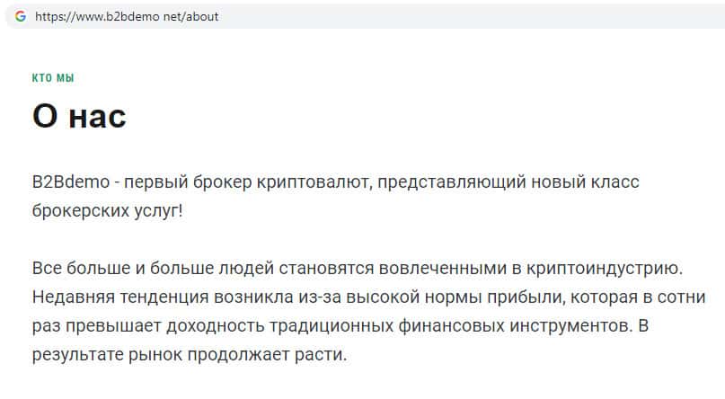 Информация на самом сайте конторы Б2Б Демо сильно отличается от того, что пишут мошенники в своей документации. На самом деле аферисты B2BDemo не имеют права навязчиво рекомендовать пользоваться какими-либо услугами их компании, а так же рекомендовать переводить свои денежные средства в криптовалюту.