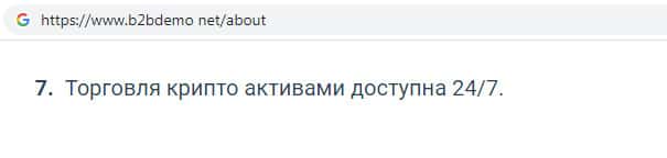 Шулера B2BDemo утверждают, что торговля криптовалютой здесь доступна круглосуточно. Но при этом в других разделах сайта имеется иная информация о том, что сайт данной брокерской конторы работает по определенным часам, то есть не круглосуточно. Внимательно читайте всю информацию на сайте Б2Б Демо и не верьте их обещаниям !!!