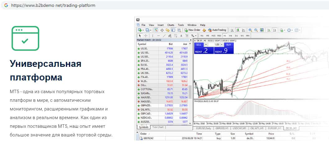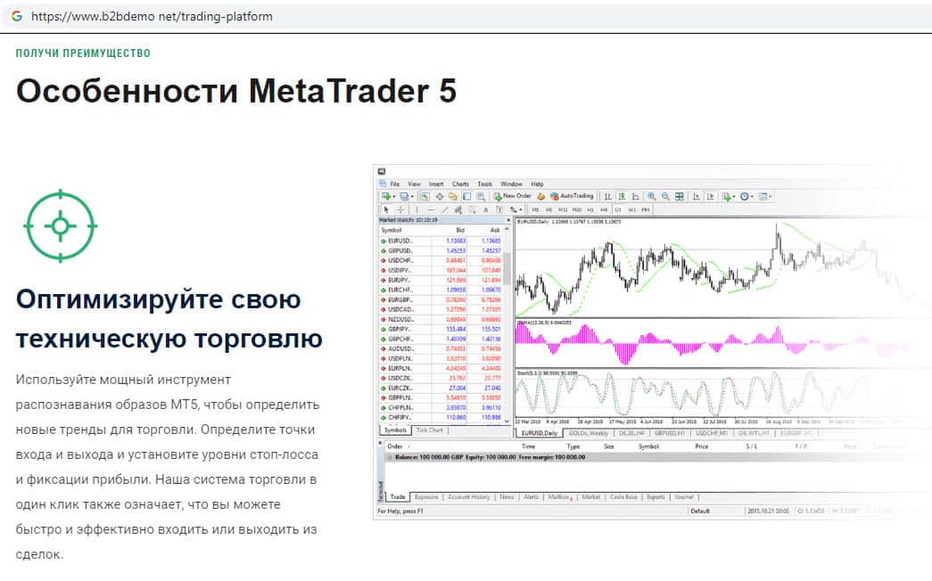 Торговая платформа на сайте мошеннической организации Б2Б Демо стандартная и не удобная. Отличительных особенностей у нее нет потому, что в любом случае всю прибыль получает только сам брокер. Торговые инструменты такие же как и на сайтах подобных жульнических организаций.