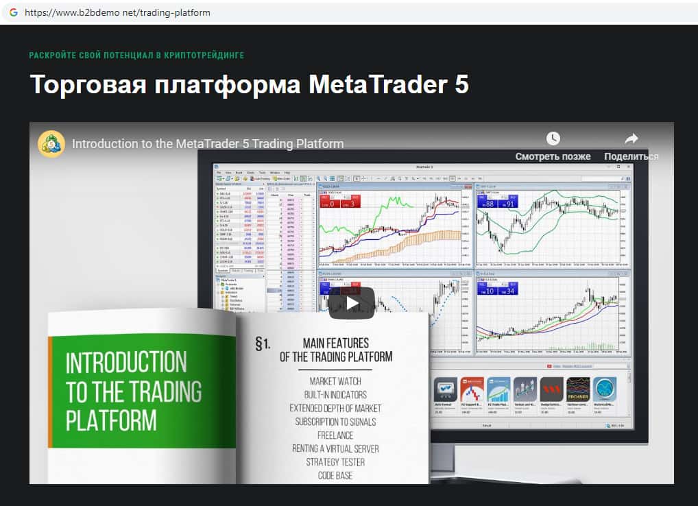 На сайте брокерской конторы B2BDemo было обнаружено видео о торговой платформе данной организации, вся информация в котором полностью на английском языке. Преимуществ у торговой платформы Б2Б Демо Нами не обнаружено, поэтому верить предоставленной ими информации не стоит !!!