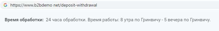 Аферисты B2BDemo указывают, что время обработки платежа зависит от времени подтверждения транзакции. Зачастую после того, как клиент подал заявку на вывод средств, мошенники блокируют торговый счет и забирают все денежные средства себе в карман. Поэтому не стоит надеяться на прибыль на сайте Б2Б Демо.