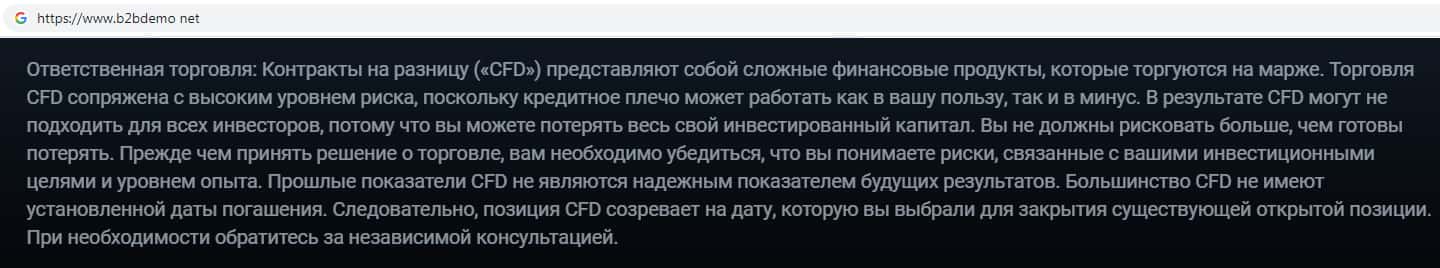 В уведомлении о рисках скам-брокер Б2Б Демо указывает о том, что торговля на сайте сопряжена определенным уровнем риска. Соответственно данная брокерская компания не несет никакой ответственности за деньги утраченные клиентом на их фальшивом сайте. В данном случае шулера B2BDemo ссылаются на ошибочный выбор торговой стратегии клиента.