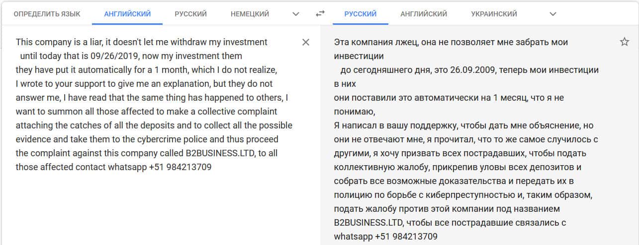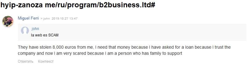 Все реальные отзывы людей о мошенниках Б2Бизнес Лтд были отрицательными. Оно и не удивительно, потому что для того, чтобы были положительные жулики зачастую нанимали специальных ботов, которые их строчили. Только это не имело ничего общего с реальностью, потому что оставалось ложью.