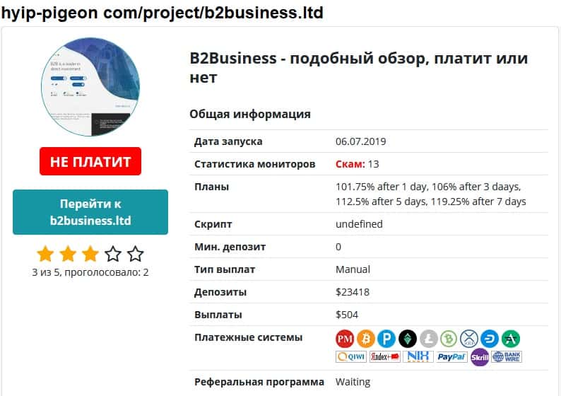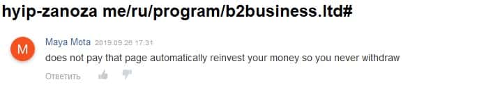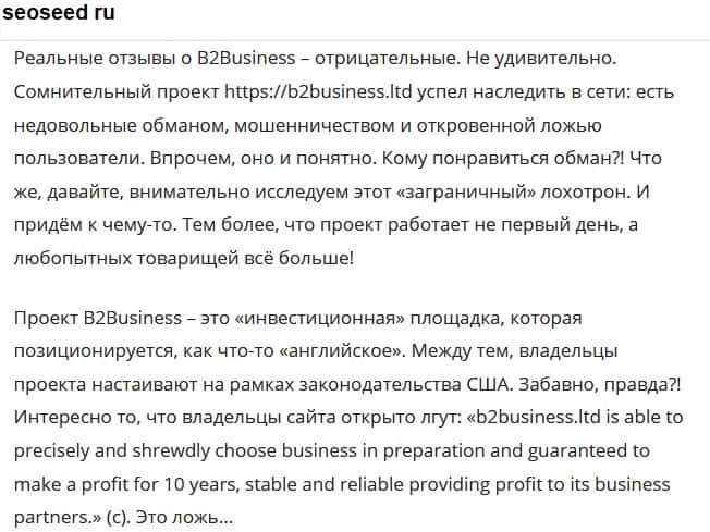 На другом авторитетном ресурсе прямо говорят о том, что B2Business Ltd - это обычная финансовая пирамида, которая грабит доверчивый народ. Связываться с ними нельзя. Людям свойственно желание получить деньги без каких-либо усилий. Именно на таких примитивных чувствах и играют разного рода жулики.