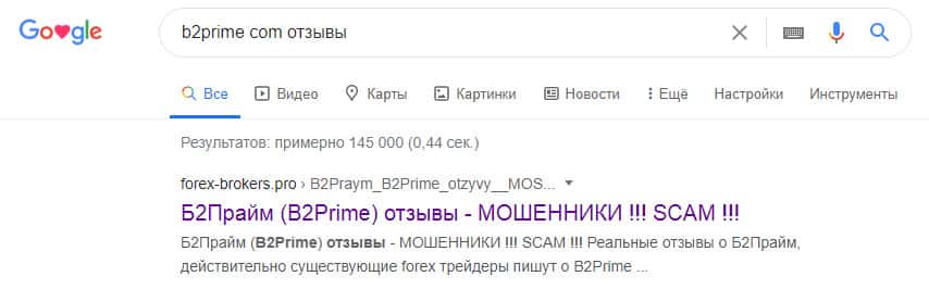 Ввиду крайне низкой популярности аферистов B2Prime на просторах сети интернет жулики Б2Прайм так и не обзавелись достаточной популярностью для привлечения пользователей в свою помойку, в связи с чем в интернете нету никакой информации о проходимцах B2Prime. На изображении, расположенном ниже, вы можете увидеть результаты поиска шулеров.