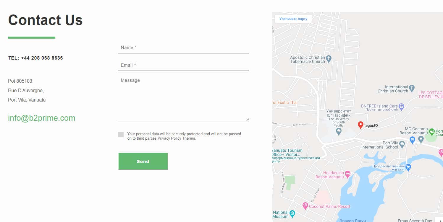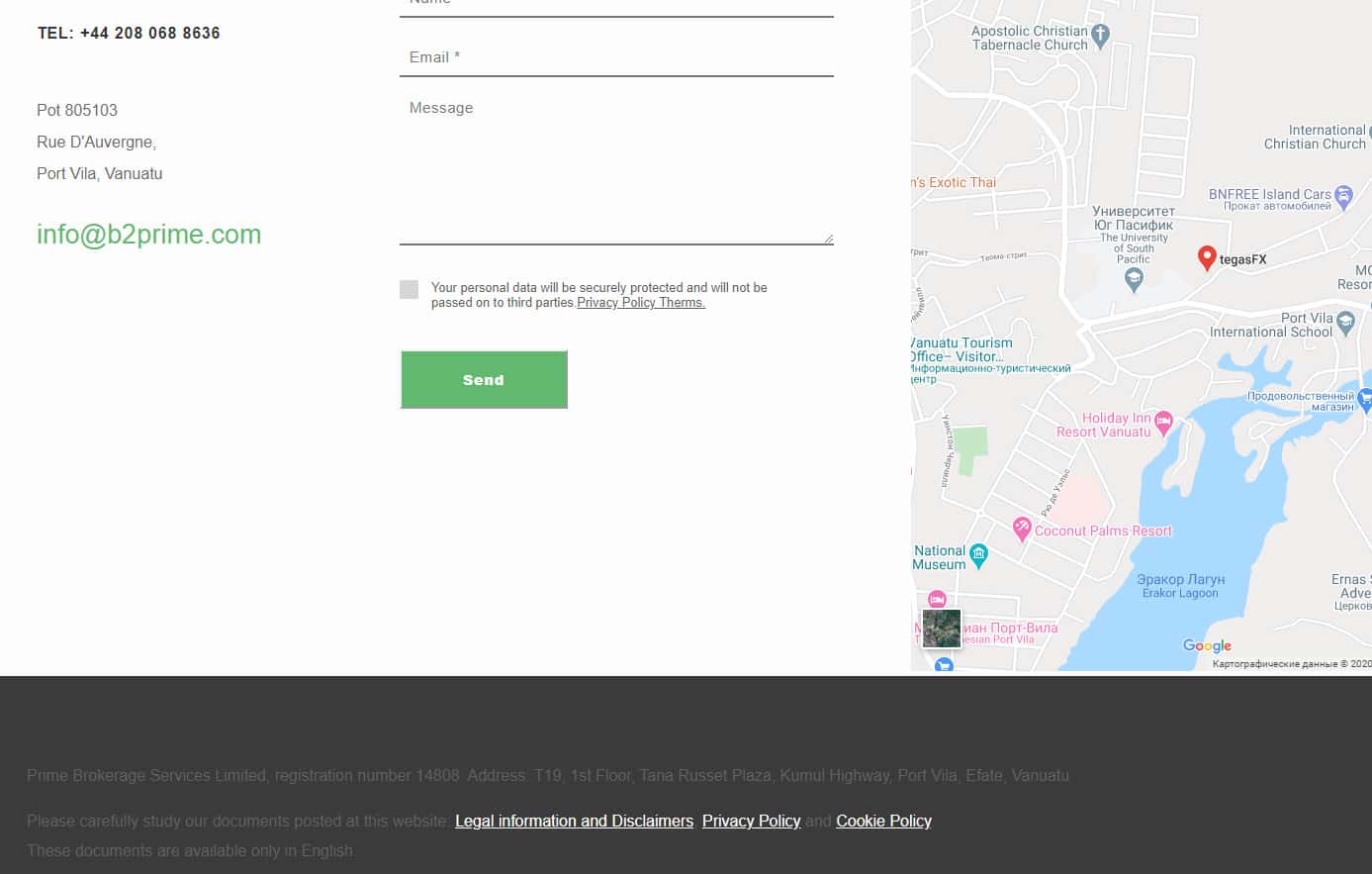 Под свои довольно сомнительные контакты аферисты Б2Прайм не отводили отдельный раздел своего сайта, вместо этого шулера B2Prime разместили свои контакты в конце подвального сайта. Данных контактов у аферистов Б2Прайм довольно мало, что говорит об их не особом желании иметь дело с наивной клиентурой. Итак контакты жуликов B2Prime: