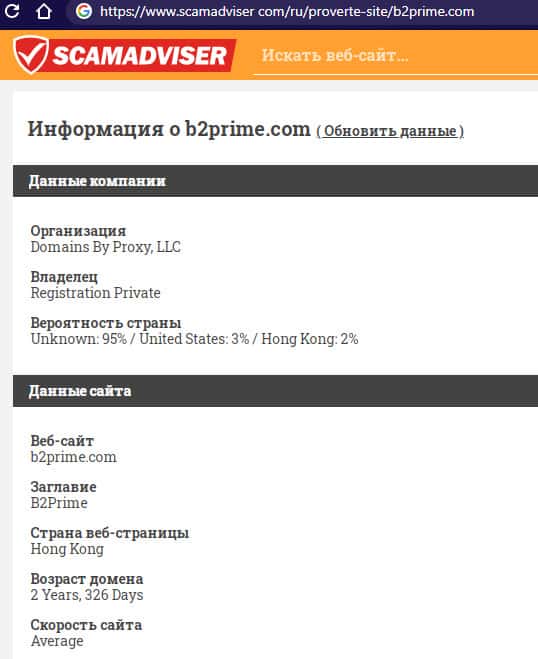 scamadviser com - сайт с технической информацией о жуликах B2Prime