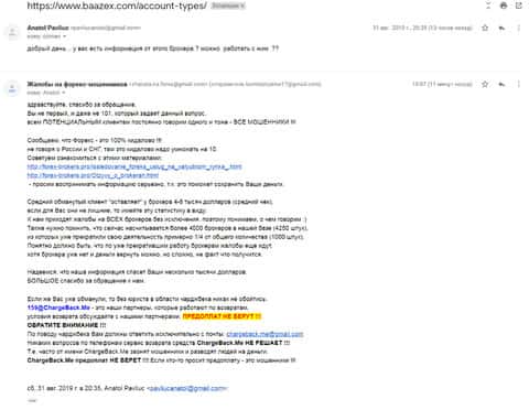 Основанием для начала анализа деятельности брокера Баазекс и написания данной статьи послужила жалоба клиента данной мошеннической конторы, поступившая на почту сайта по сбору информации о мошенниках Форекс, как мошенники Баазекс занимаются втягиванием людей в лохотрон.