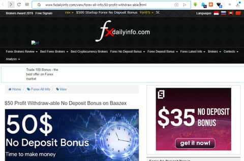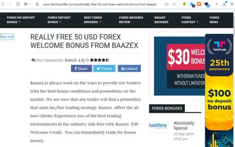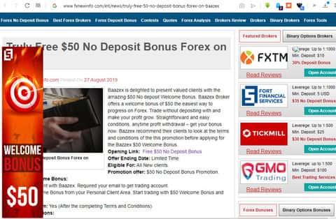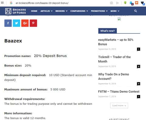 Портал brokersofforex содержит рекламу бонусной программы компании Баазекс с реферальной ссылкой. В первом случае бонус в $50 при регистрации, во втором 20% бонуса при перечислении на счет денежных средств! Но за кулисами: в течение этого года Вам не удастся вывести свои средства, пока будет действовать бонус.