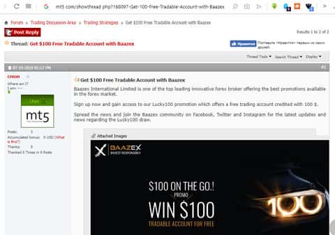 Проплаченные отзывы и реклама компании содержаться не только в статьях интернет ресурсов, но и на форумах, посвященных финансовым брокерам и торговым платформам. Вот пример такой рекламы на форуме mt5, где говорится и лидере финансового рынка - мошенниках Баазекс и их бонусах на недепозитный счет.
