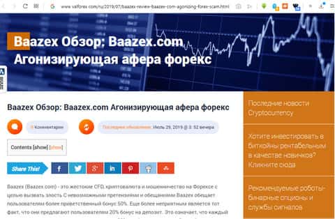 Не упустили свой шанс заработать и на сайте forexbonusnews, где размещена рекламная статья Баазекс. Она описывает все прелести торговли вместе с брокером Баазекс, предоставляя ссылку на его портал, чтобы окончательно затянуть аркан на шее ещё ничего не понимающего наивного пользователя, поверившего в бесплатный сыр.