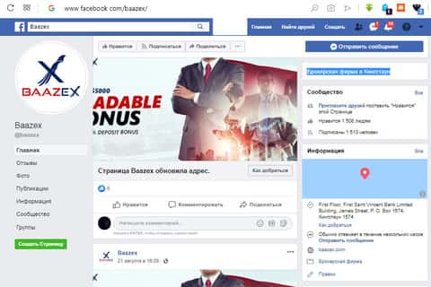 Сразу же вверху страницы имеются ссылки на аккаунты компании в социальных сетях. Страница в фейсбук имеет полторы тысячи подписчиков, а компания называет себя Брокерской фирмой в Кингстаун. Равносильна ли аренда кладовки в офисном центре получению законных документов о регистрации компании? Думаю, для мошенников - да, равнозначна.