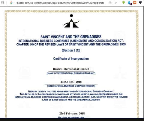 Этот брокер принадлежит Baazex International Limited, которая зарегистрирована в Сент-Винсенте и Гренадинах. Эта оффшорная зона известна своими слабыми бизнес-правилами и низкими корпоративными налогами, что делает её очень привлекательной для мошеннических компаний и тех, кто стремится сократить финансовые и нормативные рамки.