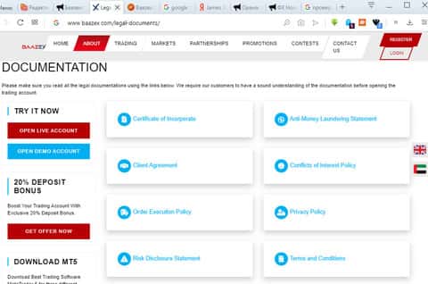На сайте Баазекс представлены к ознакомлению такие документы как соглашение, предупреждение о рисках, разрешение споров и др. Все эти документы написаны на английском языке и призваны не столько внести ясность, как запутать окончательно пытливого клиента.