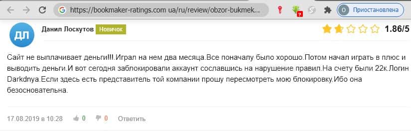 В представленном ниже отзыве клиент описывает ситуацию, когда после удачных ставок он решил вывести выигрыш, его счет был заблокирован под предлогом нарушения клиентом правил.