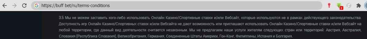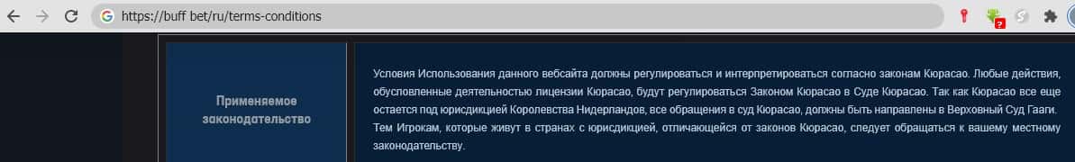 Как сообщается на портале регулятора азартных игр острова Кюрасао, в нижнем колонтитуле сайта, имеющего лицензию, должен находится соответствующий значок со ссылкой на лицензию на портале curacao-egaming com, который у Buff Bet отсутствует.