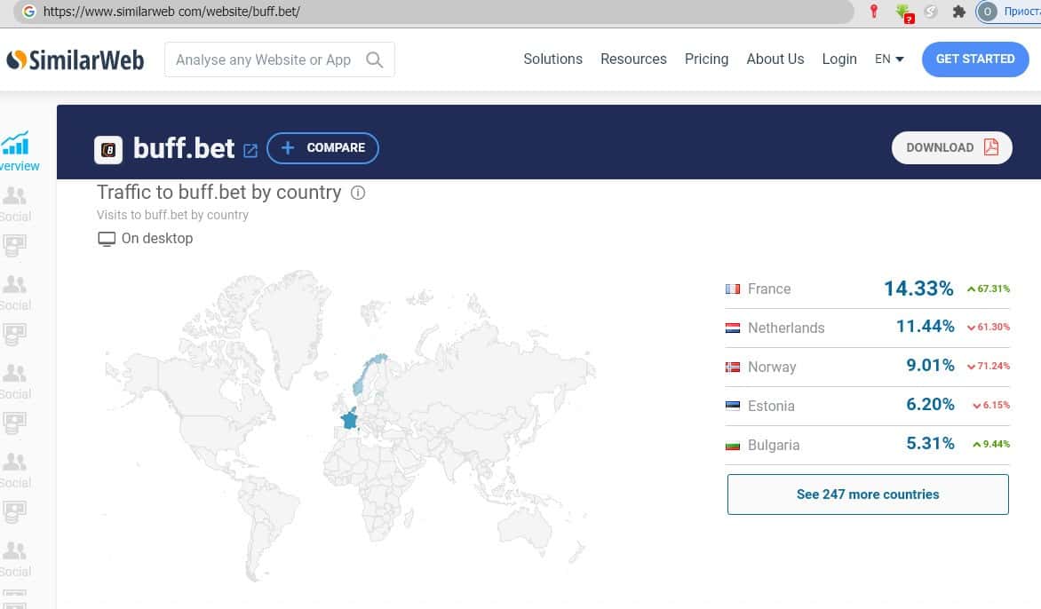 Портал similarweb com приводит количественные показатели трафика портала букмекерской конторы Buff Bet, где просматривается трафик со странами в которых мошенники якобы не работают ввиду запрета азартных игр законодательством этих стран.