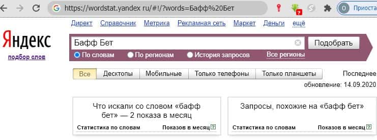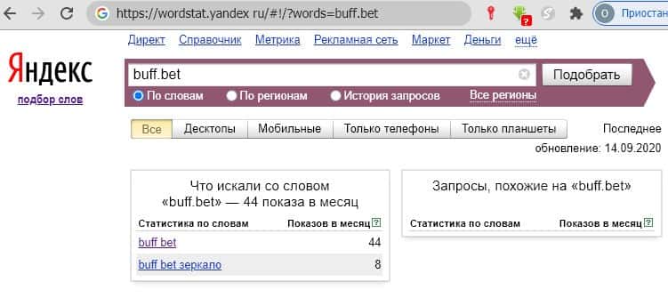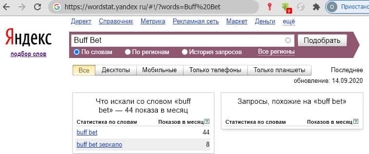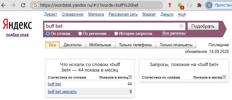 - Анализ количества поисковых запросов по бренду Buff Bet в Яндекс Вордстат